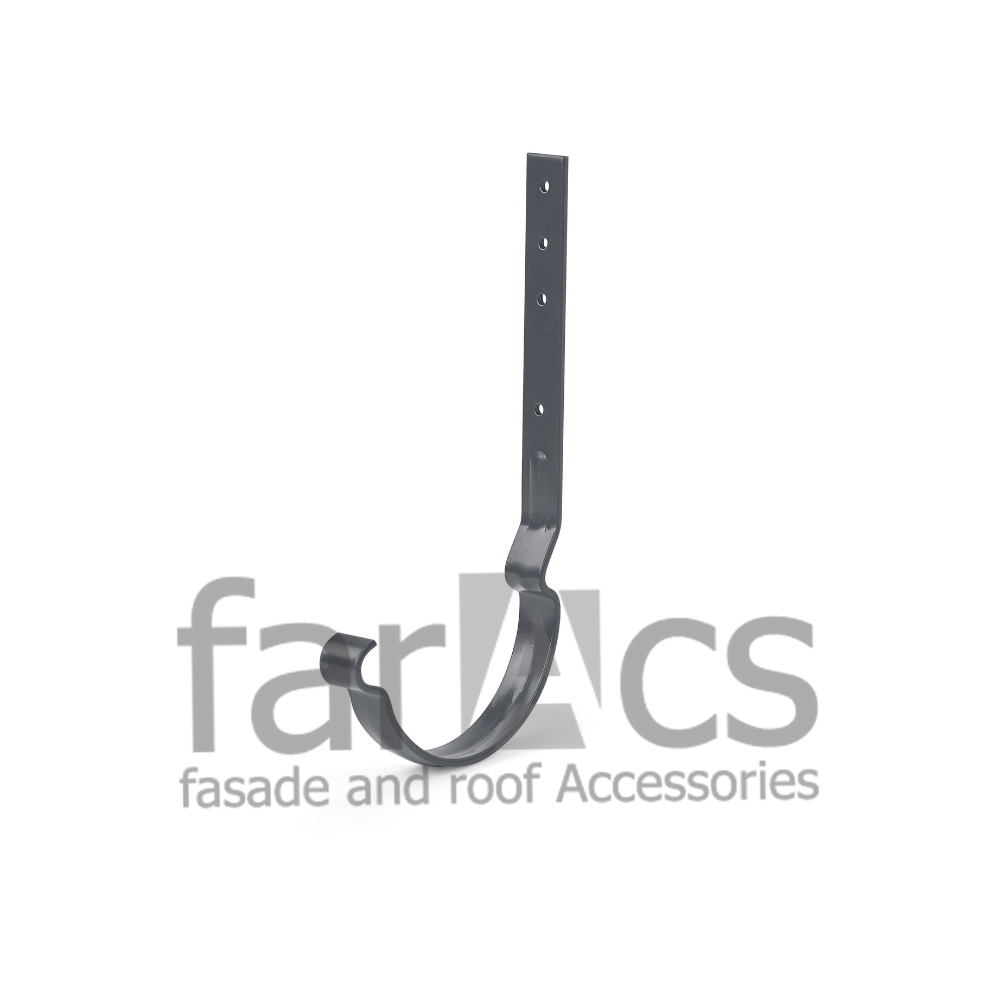 Предназначен для крепления желоба к обрешетке кровли. Длина - 290 мм., толщина стали - 4 мм. Металлическая водосточная система FarAcs изготавливается из высококачественной российской стали толщиной 0,52мм с наивысшим, первым, классом цинкования. На элементы системы нанесено защитно-декоративное полимерное покрытие, разработанное специально для водосточных систем. Желоб имеет увеличенную глубину, что обеспечивает повышенную пропускную способность по сравнению с аналогичными водосточными системами с диаметром желоба 125 мм.