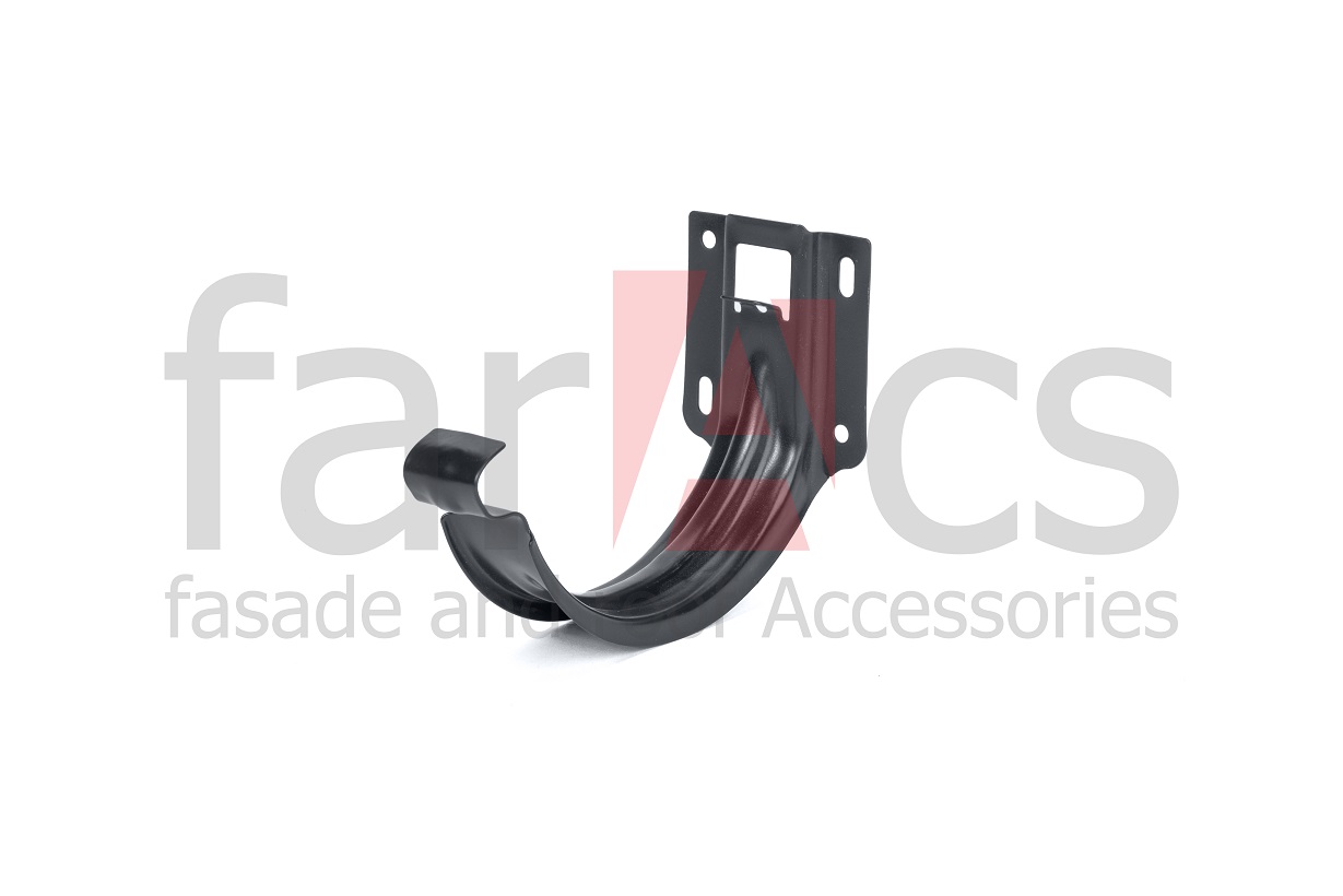 Усиленный карнизный держатель (крюк) желоба с ребрами жесткости для крепления водосточного желоба на лобовую доску.  Металлическая водосточная система FarAcs изготавливается из высококачественной российской стали толщиной 0,52мм с наивысшим, первым, классом цинкования 275г/кв.м.. На элементы системы нанесено защитно-декоративное полимерное покрытие, разработанное специально для водосточных систем. Желоб имеет увеличенную глубину, что обеспечивает повышенную пропускную способность по сравнению с аналогичными водосточными системами с диаметром желоба 125 мм.