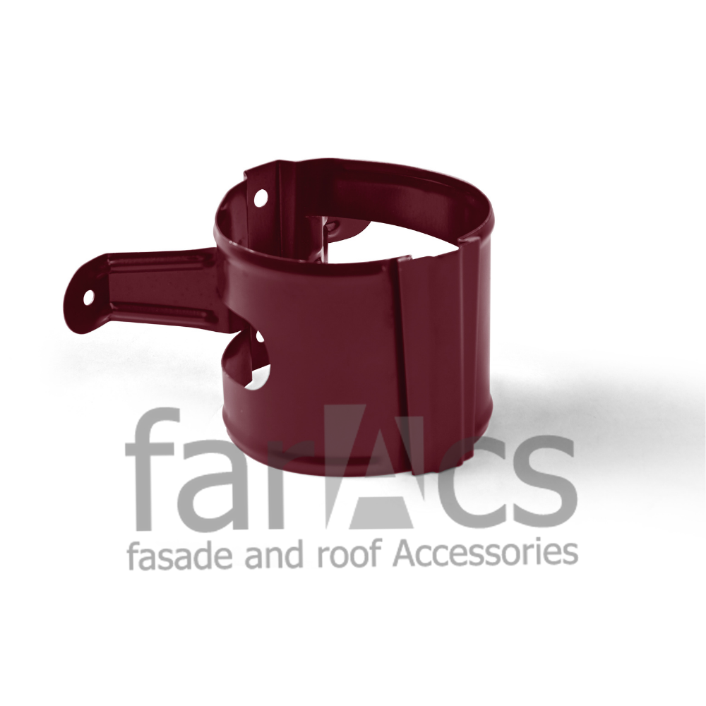 Предназначен для фиксации водосточной трубы к фасаду здания. Применяется на деревянных, вентилируемых фасадах и фасадах из сайдинга. В комплект входит хомут, клин, шпилька-шуруп, две гайки. Изготовлен из оцинкованной стали (Zn I класс) с двухсторонним полимерным покрытием 25 мкм.
