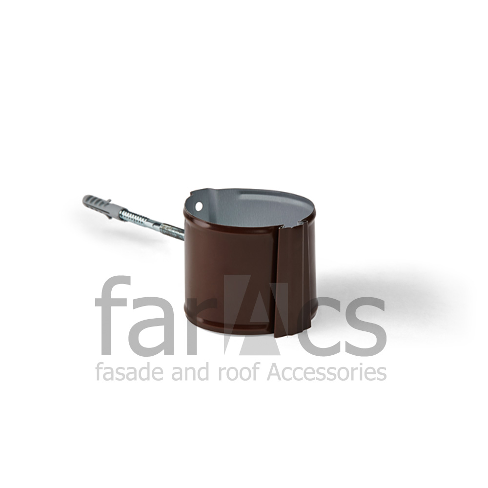 Предназначен для фиксации водосточной трубы к фасаду здания. Применяется на фасадах из твердых материалов (кирпич, бетон, камень). В комплект входит хомут, клин, саморез 8х120мм и дюбель. Изготовлен из оцинкованной стали (Zn I класс) с двухсторонним полимерным покрытием 25 мкм.