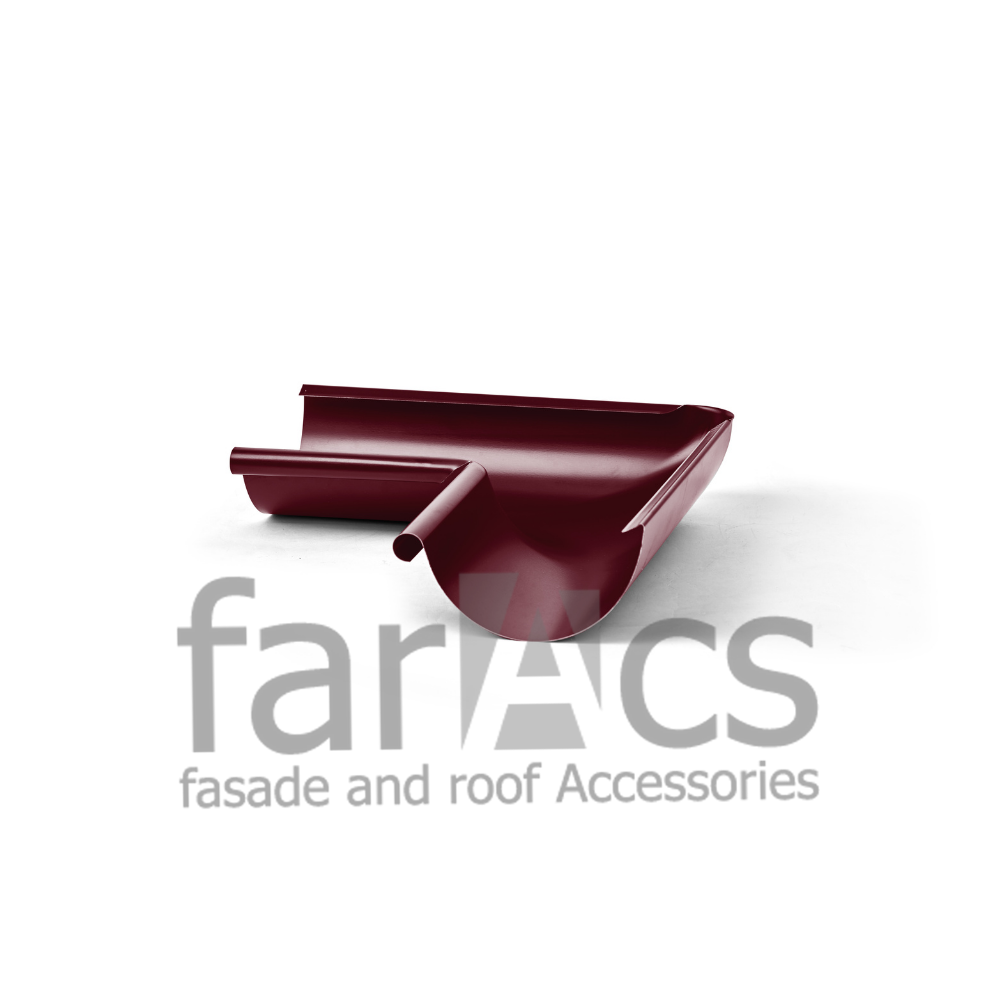 Обеспечивает непрерывность линии желоба на внутренних углах здания. Изготовлен из оцинкованной стали (Zn I класс) с двухсторонним полимерным покрытием 25 мкм. Металлическая водосточная система FarAcs изготавливается из высококачественной российской стали толщиной 0,52мм с наивысшим, первым, классом цинкования. На элементы системы нанесено защитно-декоративное полимерное покрытие, разработанное специально для водосточных систем. Желоб имеет увеличенную глубину, что обеспечивает повышенную пропускную способность по сравнению с аналогичными водосточными системами с диаметром желоба 125 мм.