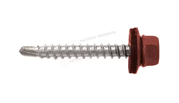 Для соединения элементов кровли советуем применять соответствующий крепёж. Специфическая форма сверла позволяет применять крепёж без предварительного засверливания, что уменьшает затраты времени и повреждение полимерного покрытия, а благодаря своеобразной форме головки достигается плотное прилегание самонарезающего винта к материалу. Саморез 4,8х35 RAL3009 (красная окись) изготовлен из высокопрочной стали и не корродирует. С помощью него вы прочно соедините составляющие кровли, а декоративно-защитный слой не подвергнется дополнительному повреждению.