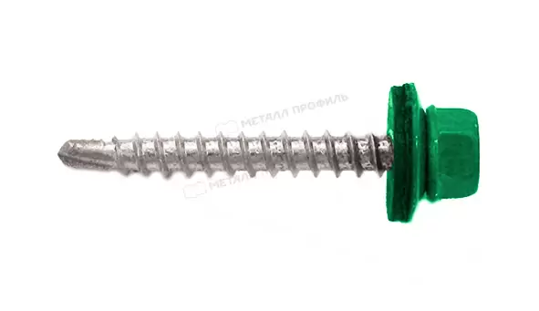 Чтобы соединить части кровли, используют специальный крепёж. Саморез 4,8х35 RAL6029 (зеленая мята) изготовлен из оцинкованной стали и не ржавеет. С его помощью элементы кровли будут надёжно соединены, а полимерный слой не будет излишне повреждён. Особая форма сверла крепежа позволяет использовать саморезы без предварительного засверливания и разрушения полимерного покрытия, а своеобразная форма головки обеспечивает плотное прилегание самонарезающего винта к материалу.