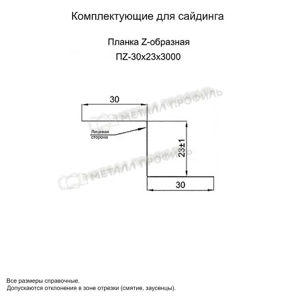 - Украшает стандартные элементы отделки сайдинга. - Планка Z-образная 30х23х3000 (ПЭ-01-9003-0.7) не корродирует. - Не выцветает. - Сталь устойчива к механическим повреждениям. Толщина оцинкованного металла с декоративно-защитным покрытием 0.7 мм. - Изготавливается в любых цветах декоративно-защитных покрытий.