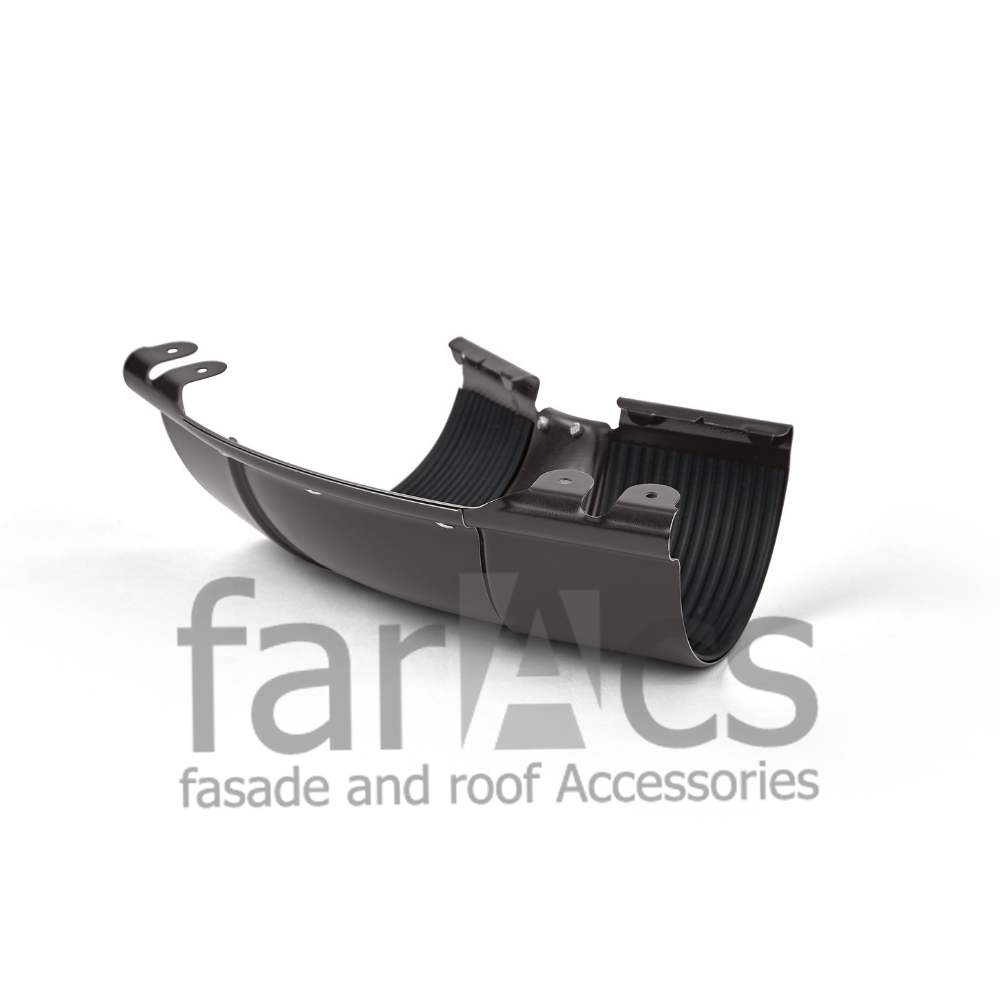 Плавный изгиб препятствует скоплению мусора, и придает особую выразительность всей системе в целом. В угол уже интегрированы уплотнители из EPDM резины и предусмотрены специальные зажимы, благодаря чему, в отличии от аналогов, не требуется приобретать дополнительные соединители желоба для стыковки.