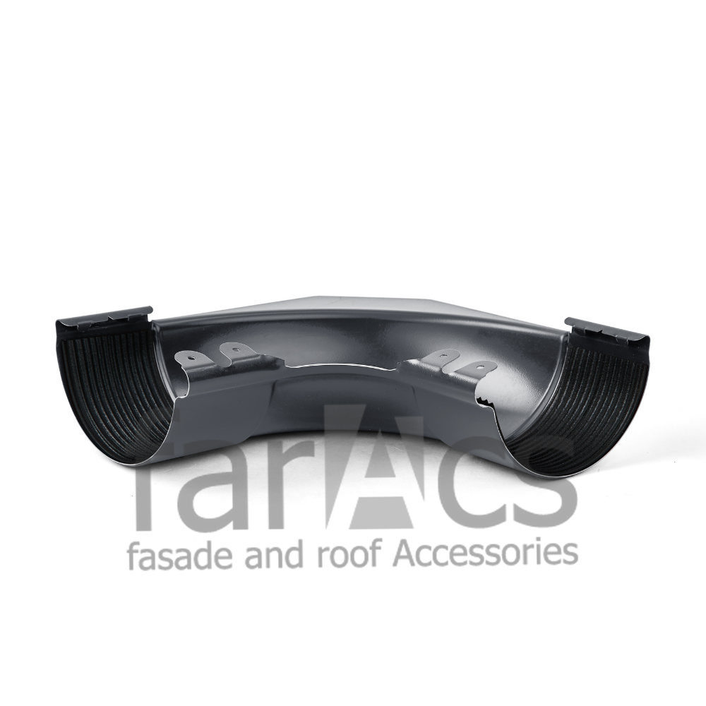 Плавный изгиб препятствует скоплению мусора, и придает особую выразительность всей системе в целом. В угол уже интегрированы уплотнители из EPDM резины и предусмотрены специальные зажимы, благодаря чему, в отличии от аналогов, не требуется приобретать дополнительные соединители желоба для стыковки.