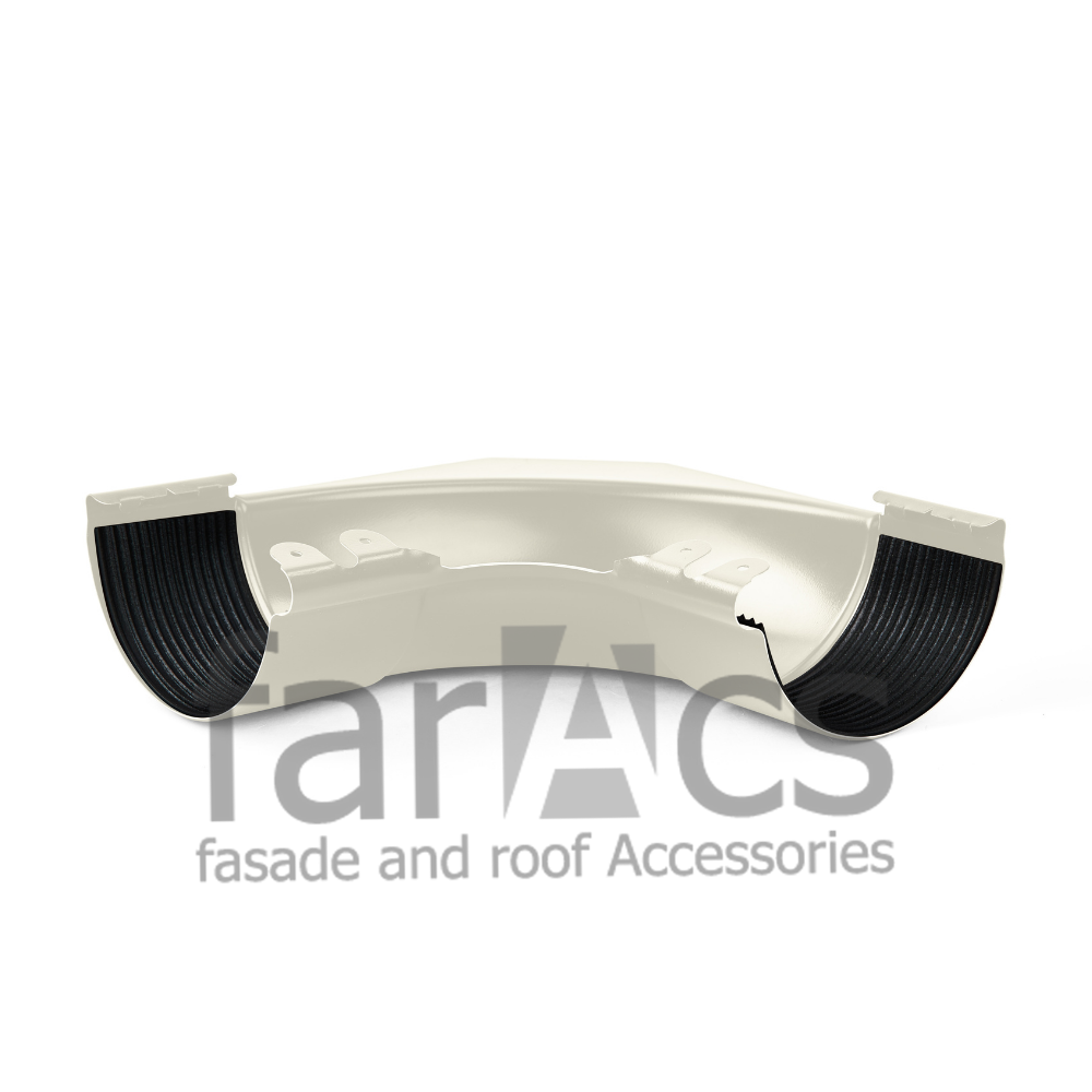 Плавный изгиб препятствует скоплению мусора, и придает особую выразительность всей системе в целом. В угол уже интегрированы уплотнители из EPDM резины и предусмотрены специальные зажимы, благодаря чему, в отличии от аналогов, не требуется приобретать дополнительные соединители желоба для стыковки.