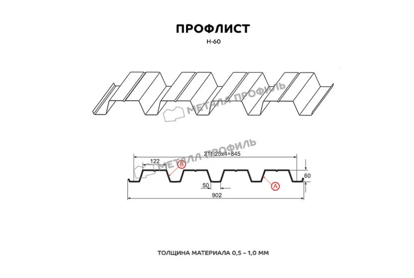 Профнастил Н-60 состоит из высоких чередующихся трапеций — узких и широких. На широких полочках есть рёбра жёсткости. Это обеспечивает высокую несущую способность Н-60, позволяет строить из него крыши с большими пролётами, несъёмные опалубки, несущие конструкции.