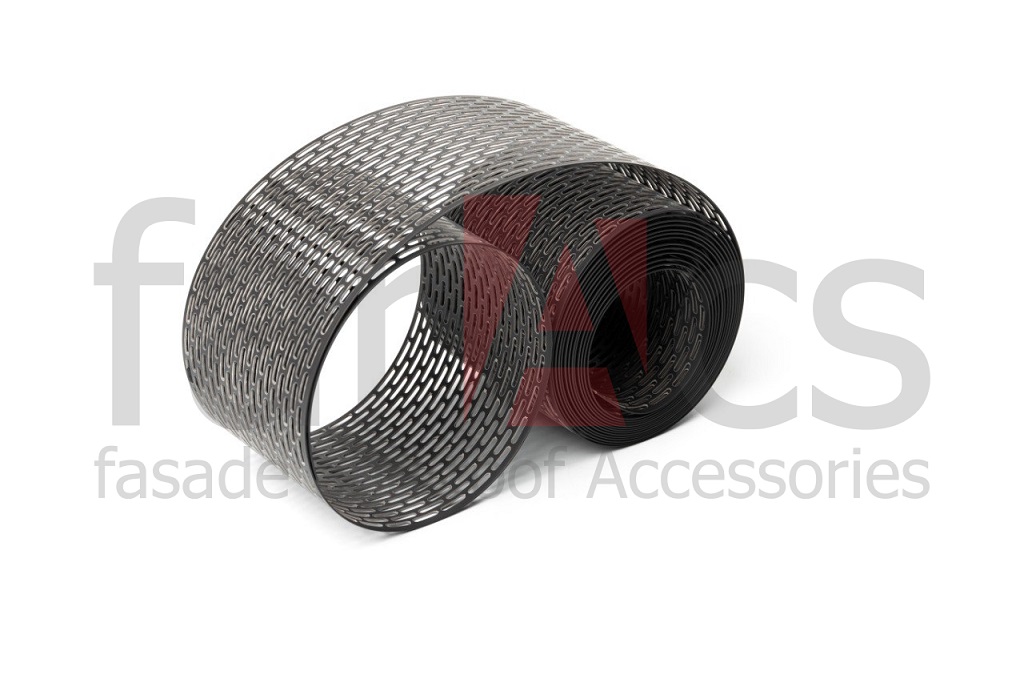 Вентиляционная лента Faracs из пвх предназначена для обустройства карнизного свеса кровли. По всей длине ленты для обеспечения вентиляции нанесены отверстия. Ширина ленты 10 см, длина 5 метров. Выпускается она в четырех цветах: белом, черном, коричневом и красном. Использоваться вентиляционная лента может с любым типом кровельного покрытия вент фасада, начиная от профнастила и заканчивая всеми видами черепицы. Для крепления используются оцинкованные гвозди или шурупы с шагом 18-20 см. Основное предназначение вентиляционной ленты заключается в обеспечении притока естественной вентиляции в вентиляционный зазор под кровлей и векнтилируемом фасаде. Помимо этого лента выполняет функцию противомоскитной сетки с крупными ячейками. Благодаря данному аэроэлементу перекрывается доступ в подкровельное пространство таким крупным насекомым, как шмели, осы, шершни и пчелы, а также мелким птицам, которые выбирают укромные места для обустройства гнезд. Рекомендуется для использоавния в загородном строительстве.