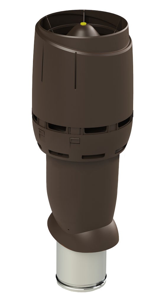 Вентиляционный выход  Vilpe Flow 160/ИЗ/700 изолированный (утепленный) вентиляционный выход увеличенной высоты внутренним диаметром 160 мм. Применяется для вывода через скатную кровлю естественной вентиляции помещений, вентиляции с использованием канального вентилятора, кухонной вытяжки. Внутренняя труба изготовлена из оцинкованной стали. Длина внутренней трубы позволяет вставить ее в подводимый воздуховод на длину 300 мм. Это облегчает вертикальный монтаж в тесных чердачных помещениях и делает конструкцию более прочной. Нижний край внутренней трубы имеет резиновый уплотнитель, герметизирующий соединение трубы и воздуховода.  Вентиляционный выход укомплектован новым улучшенным колпаком Flow, который обеспечивает на до 40% меньше потери давления в системе, лучшую защиту от атмосферных осадков, строго вертикальный поток выходящего воздуха (при использовании с кухонной вытяжкой уменьшается вероятность попадания капель масла на кровельный материал), современный дизайн.  Проходной элемент продается отдельно и подбирается по типу кровельного материала.